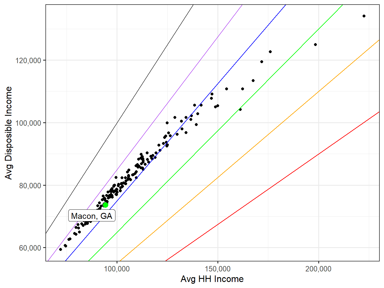 Disposable income is defined here as Household Income after accounting for Federal, State, and Local taxes. The Average Household Disposable Income is $73,680 which ranks 132nd across STI Markets.
