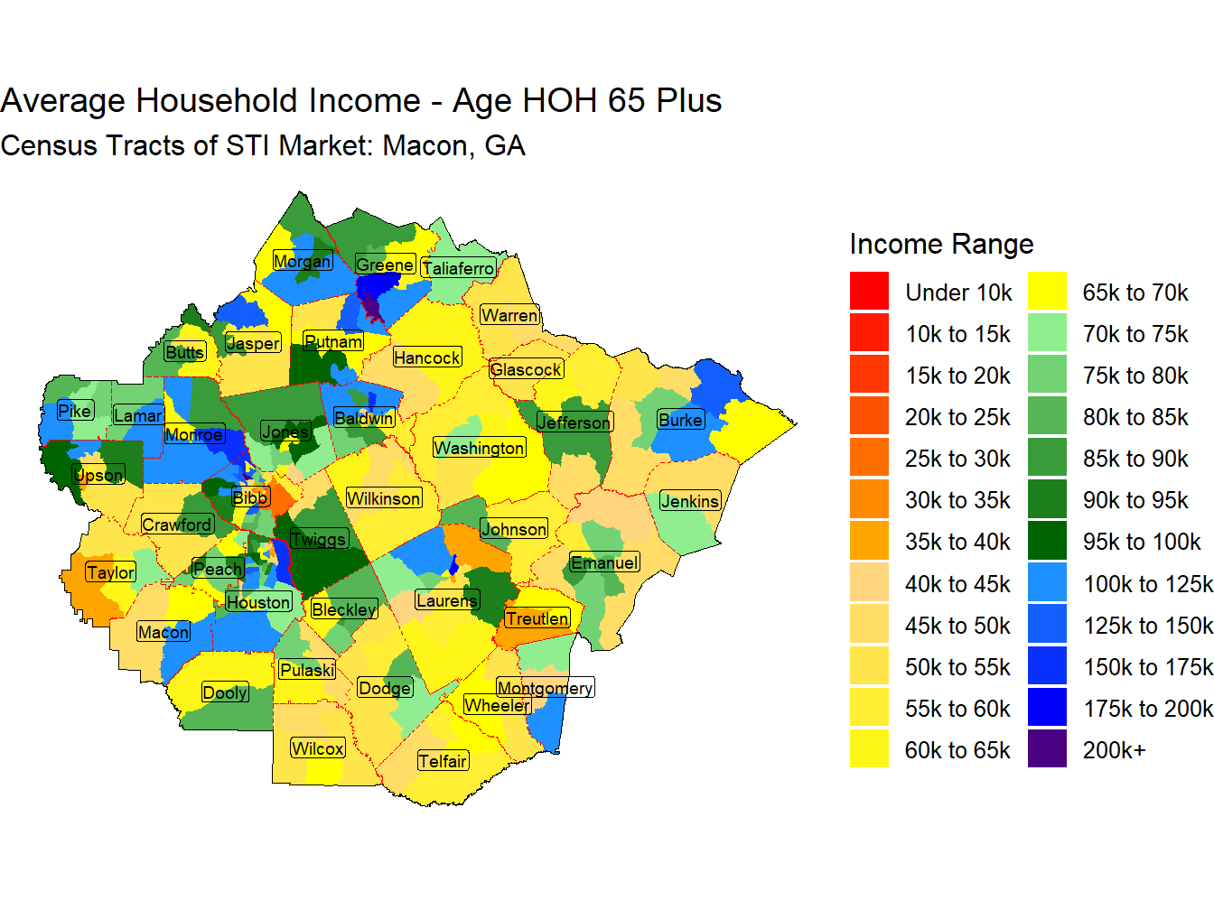 With a Median Household Income of $69,048 the Macon, GA Market ranks 135th across STI Markets.