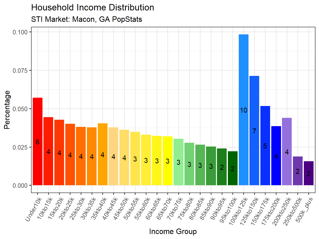 Below the multi-colored line represents the same data for household income in the Macon, GA market, but more equally lays out the distribution of population versus the income level, correcting for differences in size of income ranges. You will also notice that after 200k the income ranges are scaled down so the focus is more centered on the more numerous Households making under 200k. The black line represents the National Income Distribution for comparison.