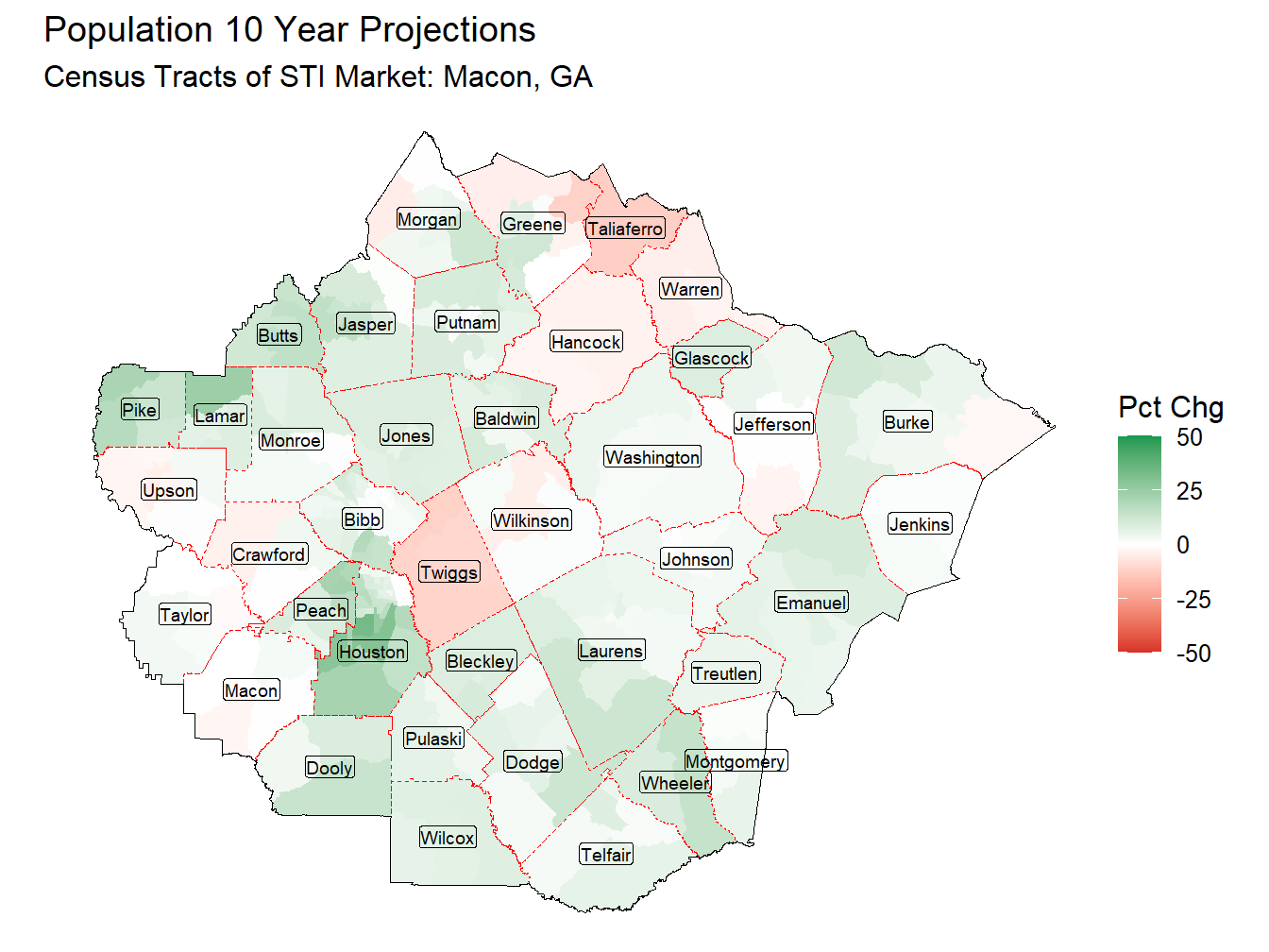 By April 2035 we project the Population of the Macon, GA Market to be 1,042,186 resulting in a change of 7.6% compared to the current Population. This projected percentage change in Population ranks 57th across STI Markets. The Macon, GA Market currently ranks 100th in overall population, and will rank 99th by April 2035.