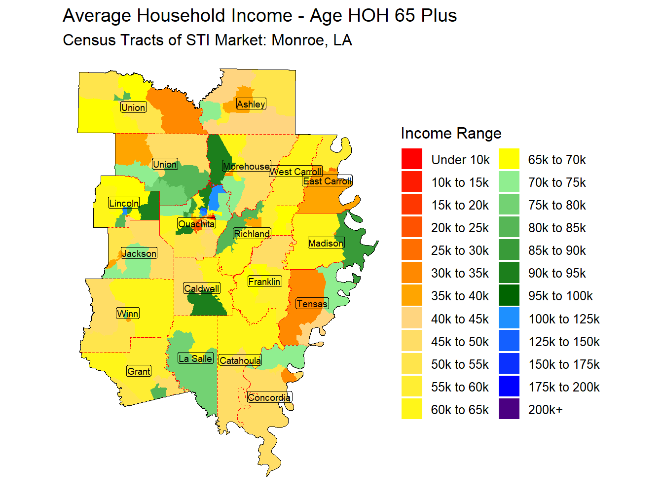 With a Median Household Income of $53,075 the Monroe, LA Market ranks 166th across STI Markets.