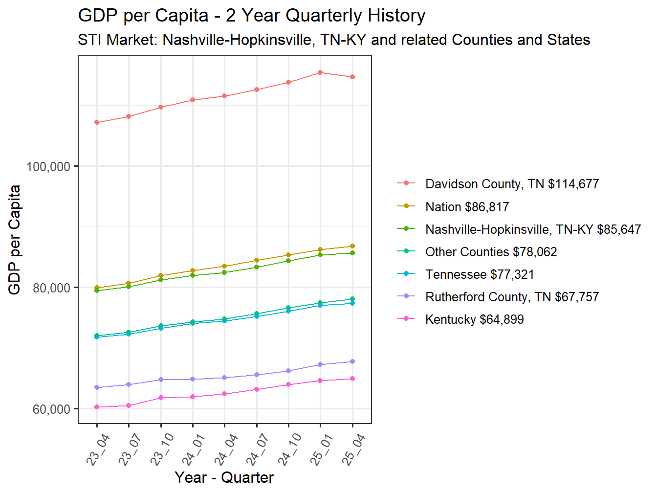 With a GDP of $264.42 billion the Nashville-Hopkinsville, TN-KY Market represents 0.89% of the $29.8 Trillion national GDP. In terms of total GDP this market ranks 31st across STI Markets.