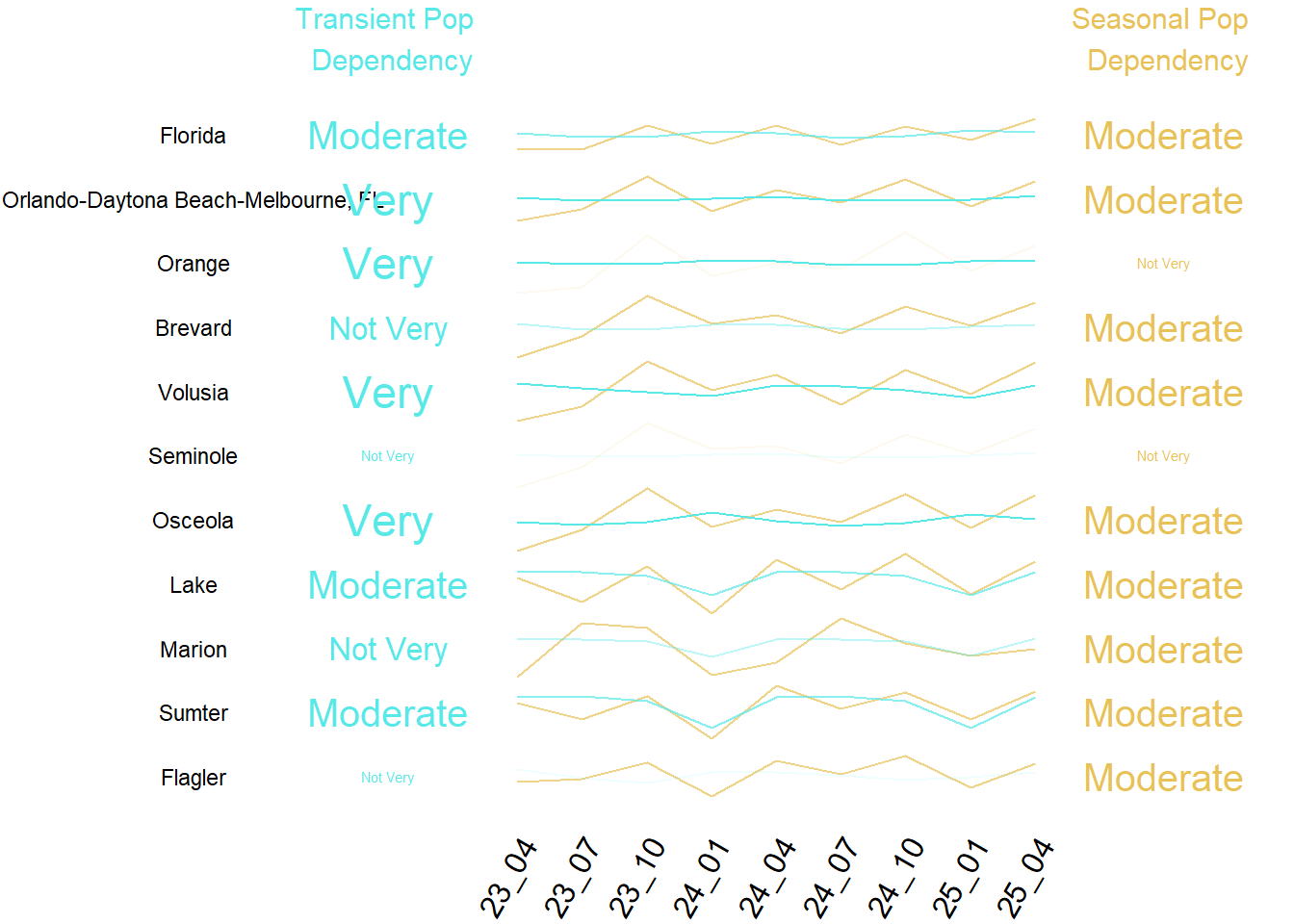 The Orlando-Daytona Beach-Melbourne, FL Market has an annual Seasonal Population of 452,722 to a Population of 5,004,239. This results in a Seasonal Dependency Ratio of 0.09, which ranks 47th across STI Markets.
