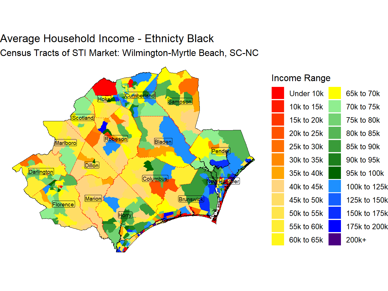 With an Average Household Income for those head of householders identifying as Non-Hispanic Black of $68,481 the Wilmington-Myrtle Beach, SC-NC market ranks 124th across STI Markets.