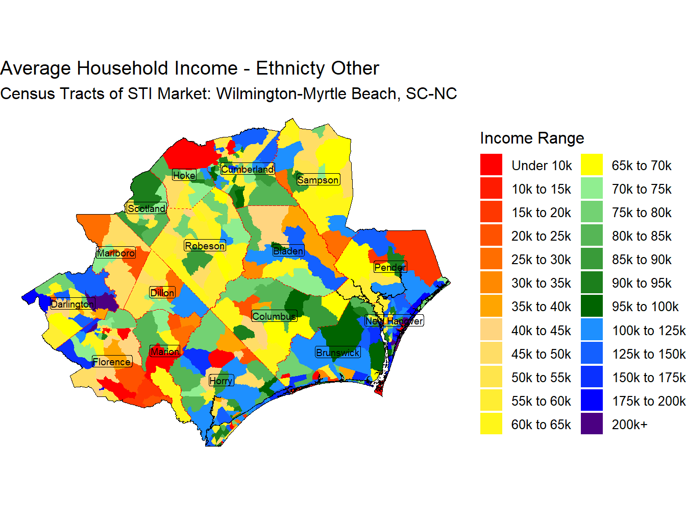 With an Average Household Income for those head of householders Non-Hispanic White of $105,214 the Wilmington-Myrtle Beach, SC-NC market ranks 99th across STI Markets.