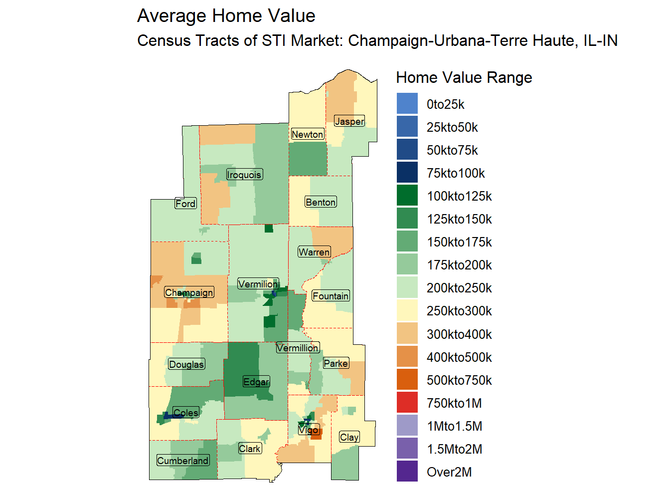 The Average Home Value for owner occupied housing units in the Champaign-Urbana-Terre Haute, IL-IN Market is $240,629. This ranks 154th across STI Markets. Over the last 2 years there has been a change of 22.9% in this markets Average Home Value, compared to a national change of 11.8%. This 2 year change in home values ranks 1st across STI Markets.