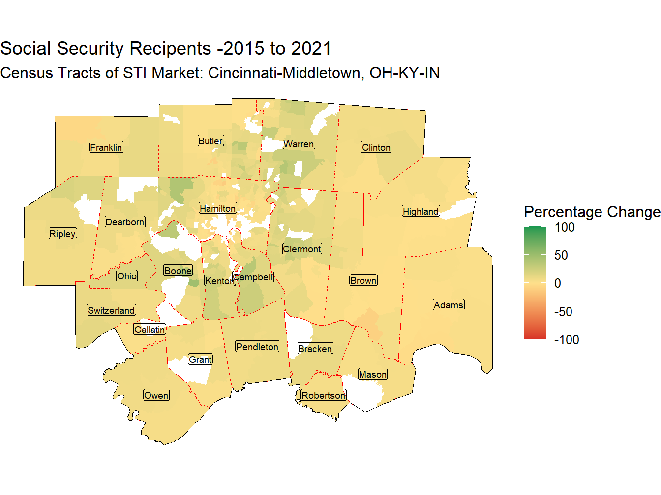 In the Cincinnati-Middletown, OH-KY-IN Market, 465,082 out of the Population of 2,504,318, 18.6%, receive some type of Social Security benefit. This is 1 times the National proportion of Social Security Recipients of 18.6%. The market ranks 122nd across STI Markets in the proportion of Social Security recipients.