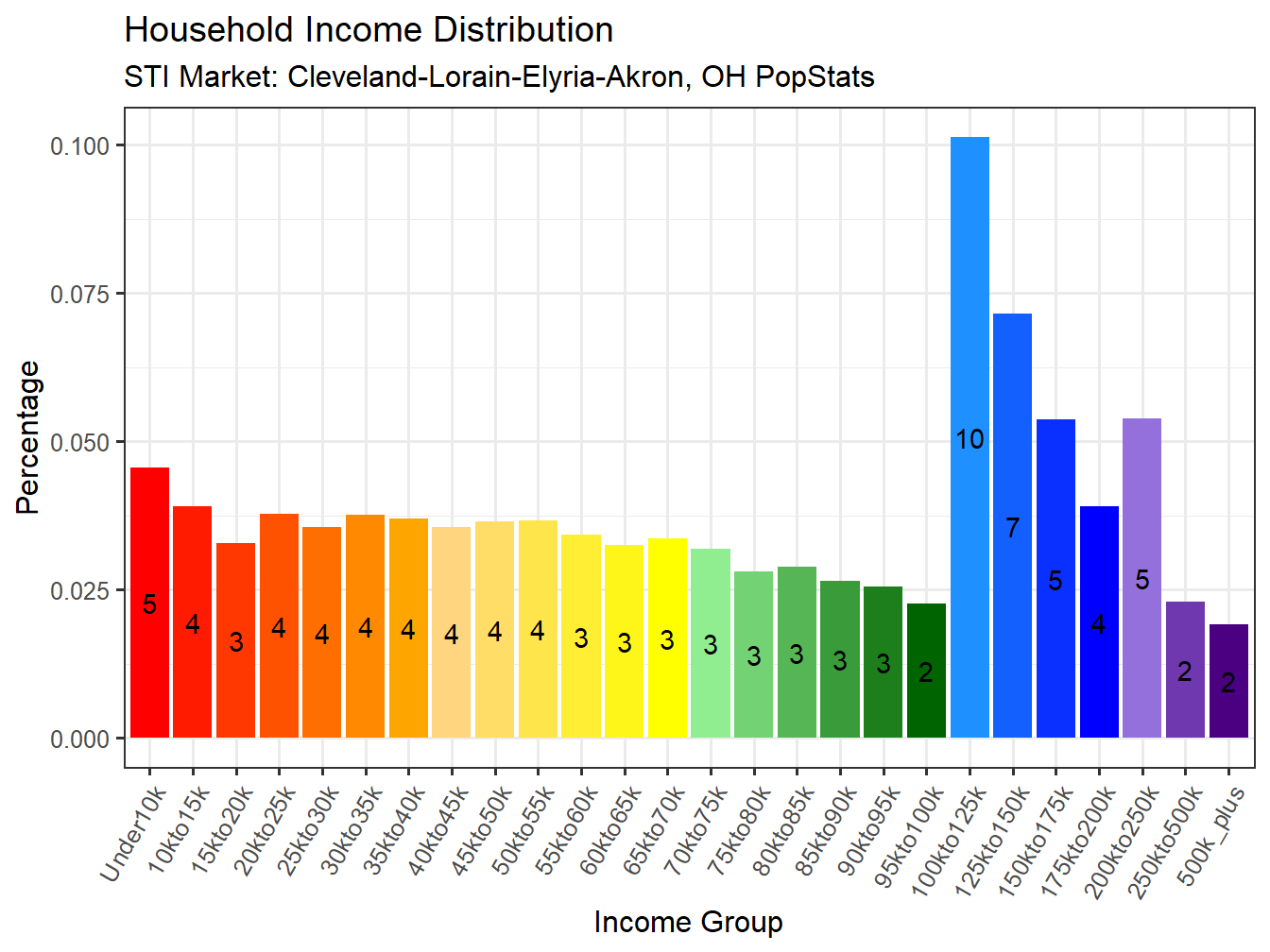 With a Median Household Income of $73,948 the Cleveland-Lorain-Elyria-Akron, OH Market ranks 104th across STI Markets.