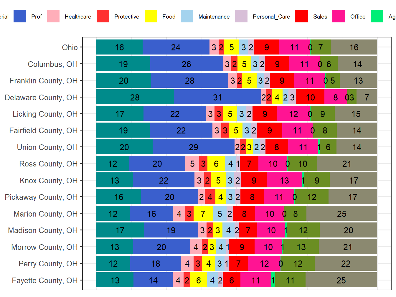 The Prof occupation makes up the largest share of employment in the Columbus, OH Market at 25.9%. This is yields a location quotient of 1.05 time the national average. Subsequently the Columbus, OH Market ranks 28th in the proportion of Prof employment across STI Markets.