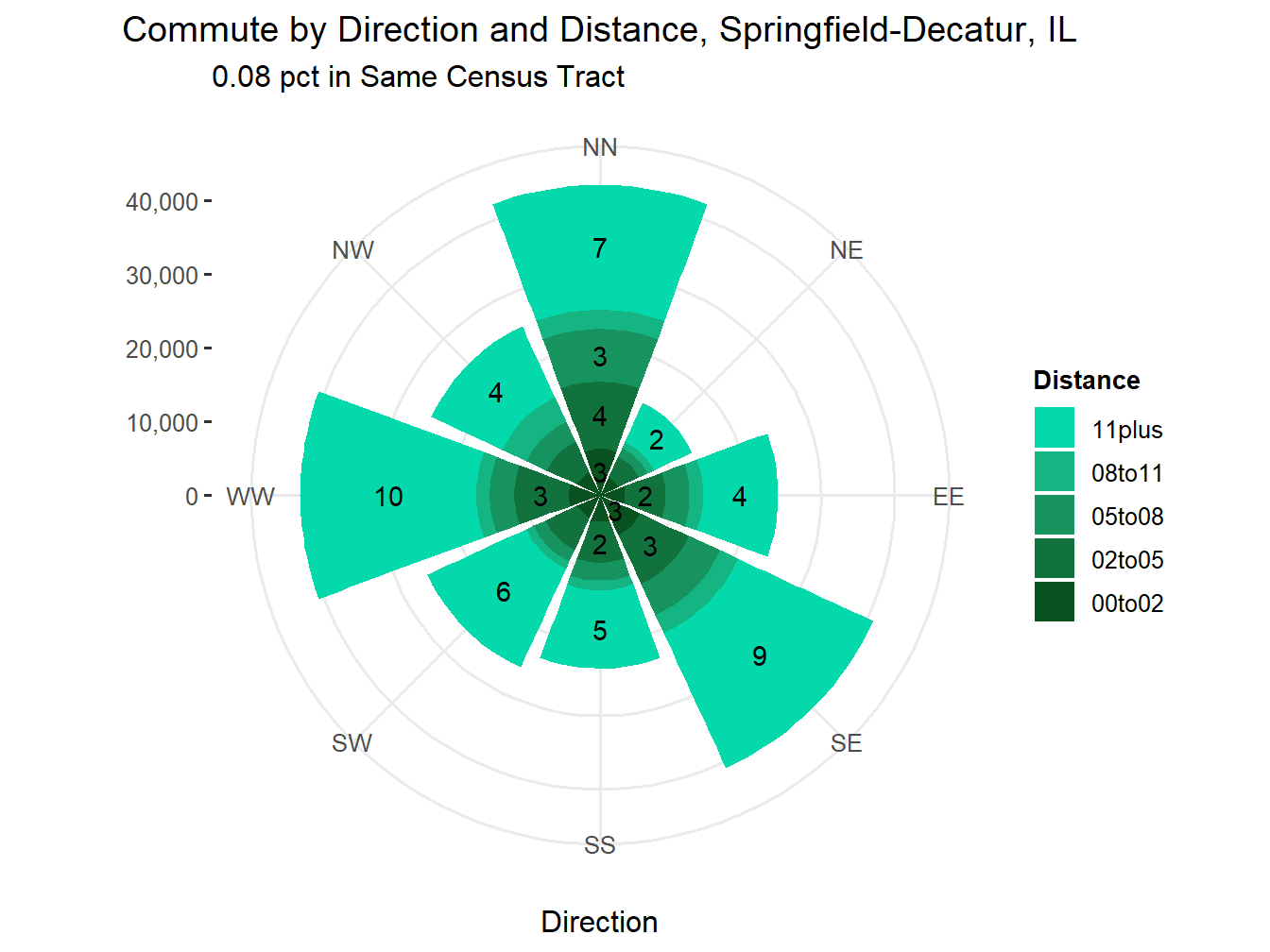 The following shows the commute to work patterns for the Springfield-Decatur, IL Market. The average direction is found via a circular mean function. The concentration is the proportion of overall travel headed in that direction and those adjacent to that direction. Length of arrow is scaled by the distance traveled. Together this allows for a general view of how traffic flows around the market each morning.