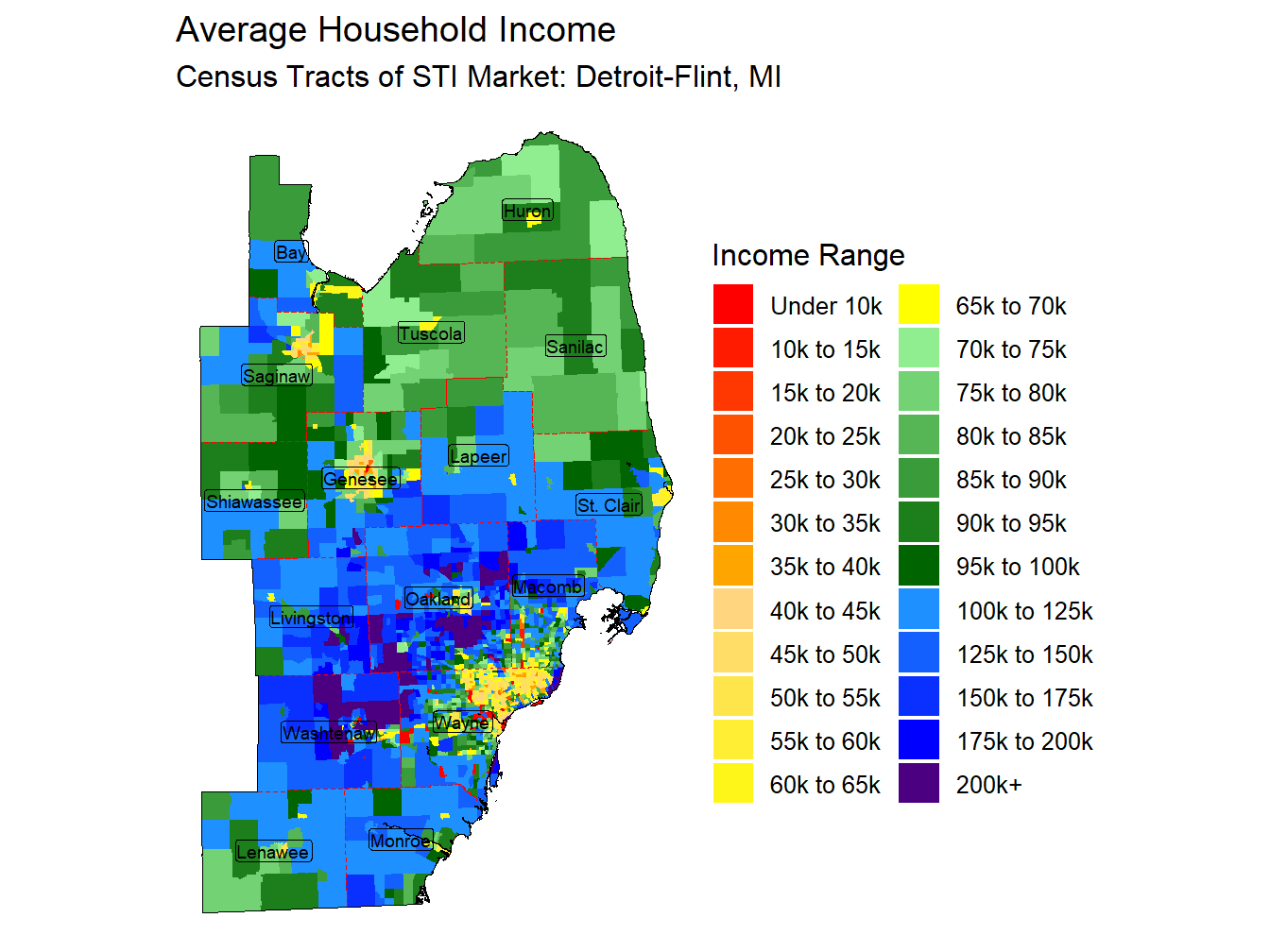 With a Median Household Income of $80,012 the Detroit-Flint, MI Market ranks 72nd across STI Markets.
