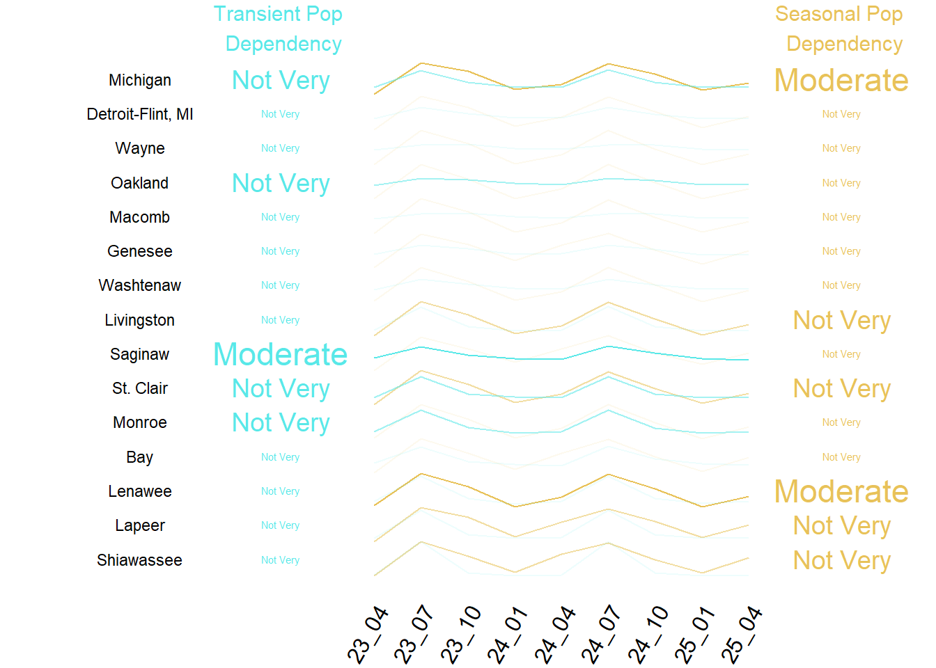 The Detroit-Flint, MI Market has an annual Seasonal Population of 142,097 to a Population of 5,947,333. This results in a Seasonal Dependency Ratio of 0.024, which ranks 143rd across STI Markets.