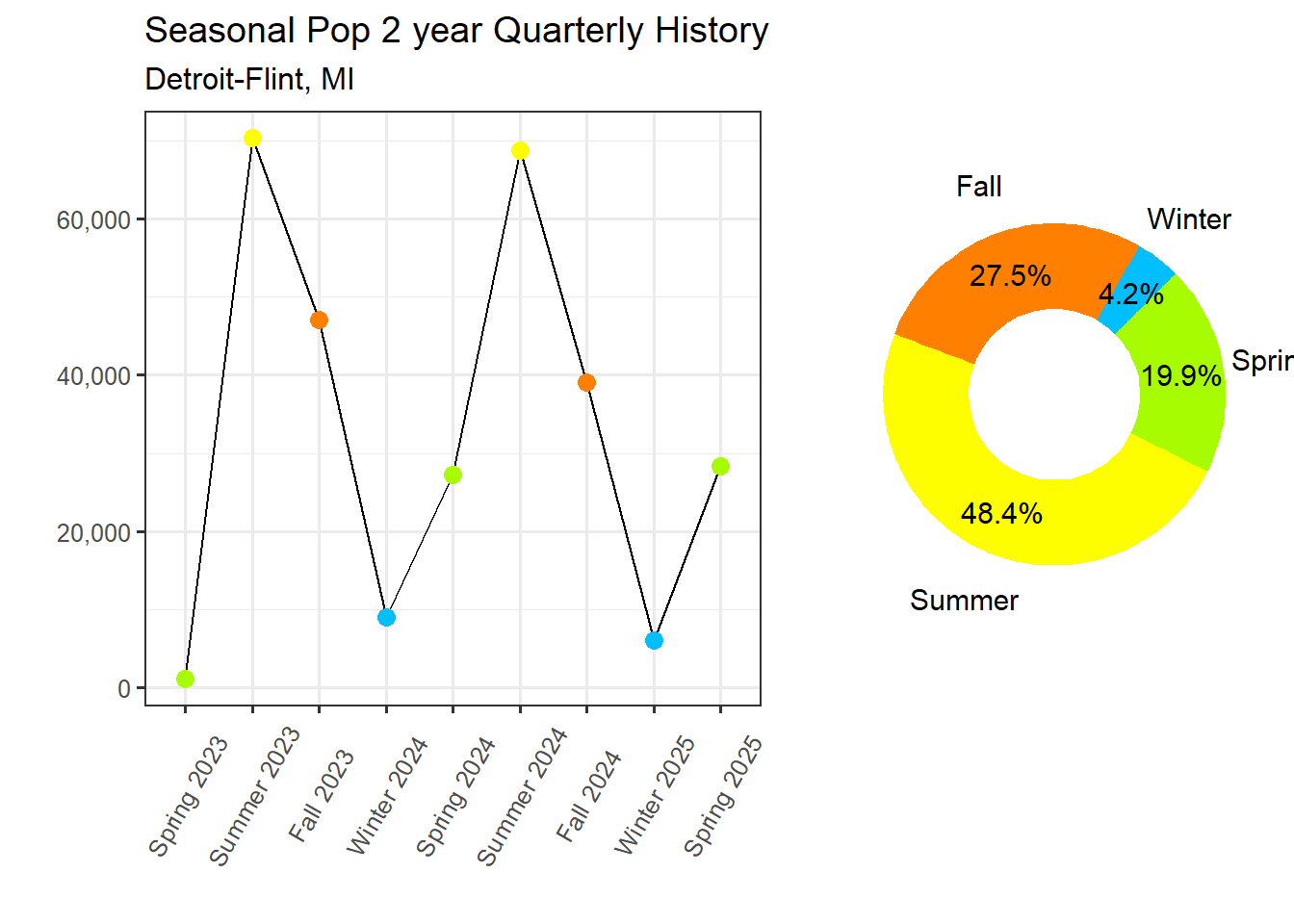 Seasonal visitation peaks in the Summer with a Seasonal Population of 68,765. The off season is the Winter with a Seasonal Population of 6,039. Given the difference between the primary and off seasons the Detroit-Flint, MI Market is classified as having a Extreme level of seasonal variation, ranking 49th across STI Markets.