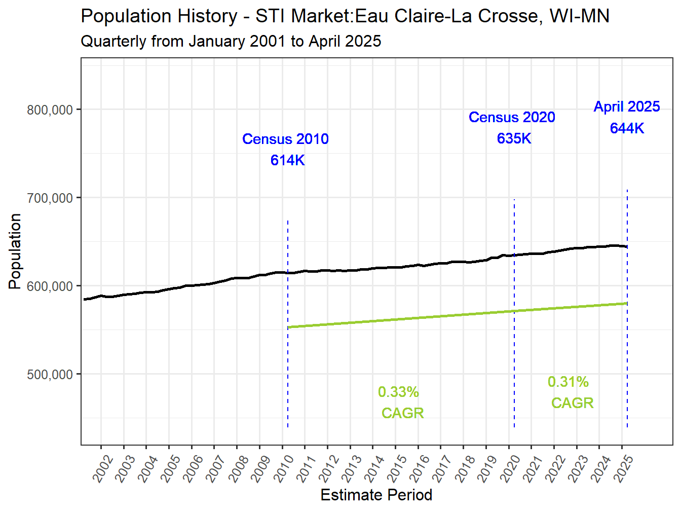With a 2 Year Compound Annual Growth Rate (CAGR) of 0.13% the Eau Claire-La Crosse, WI-MN Market is growing. It ranks 116th in 2 year population change across all STI Markets.