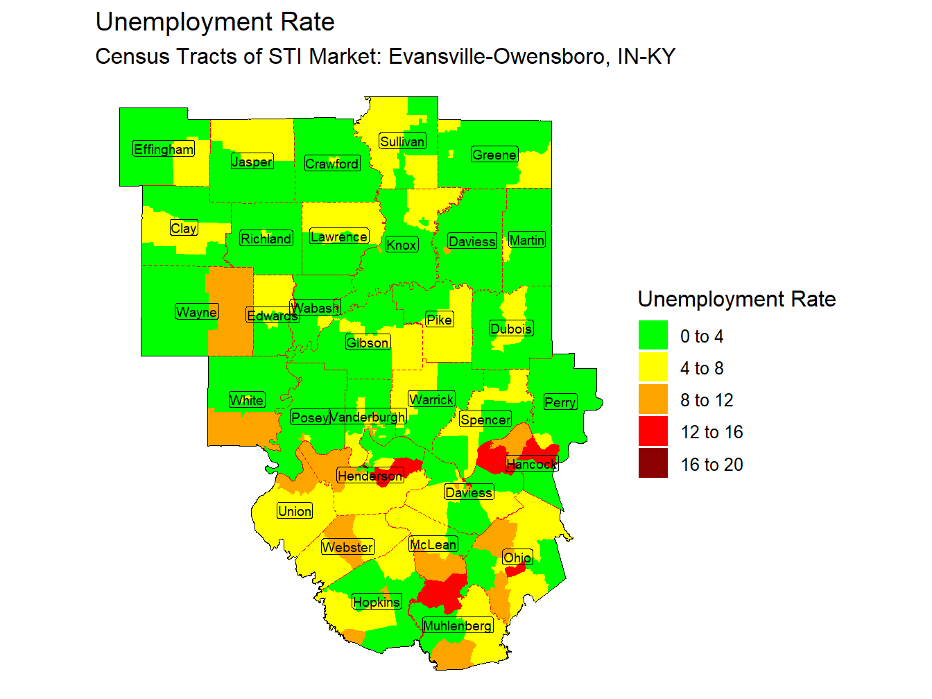 With an Unemployment Rate of 3.7% the Evansville-Owensboro, IN-KY currently ranks 93rd in Unemployment among the 167 STI Markets.