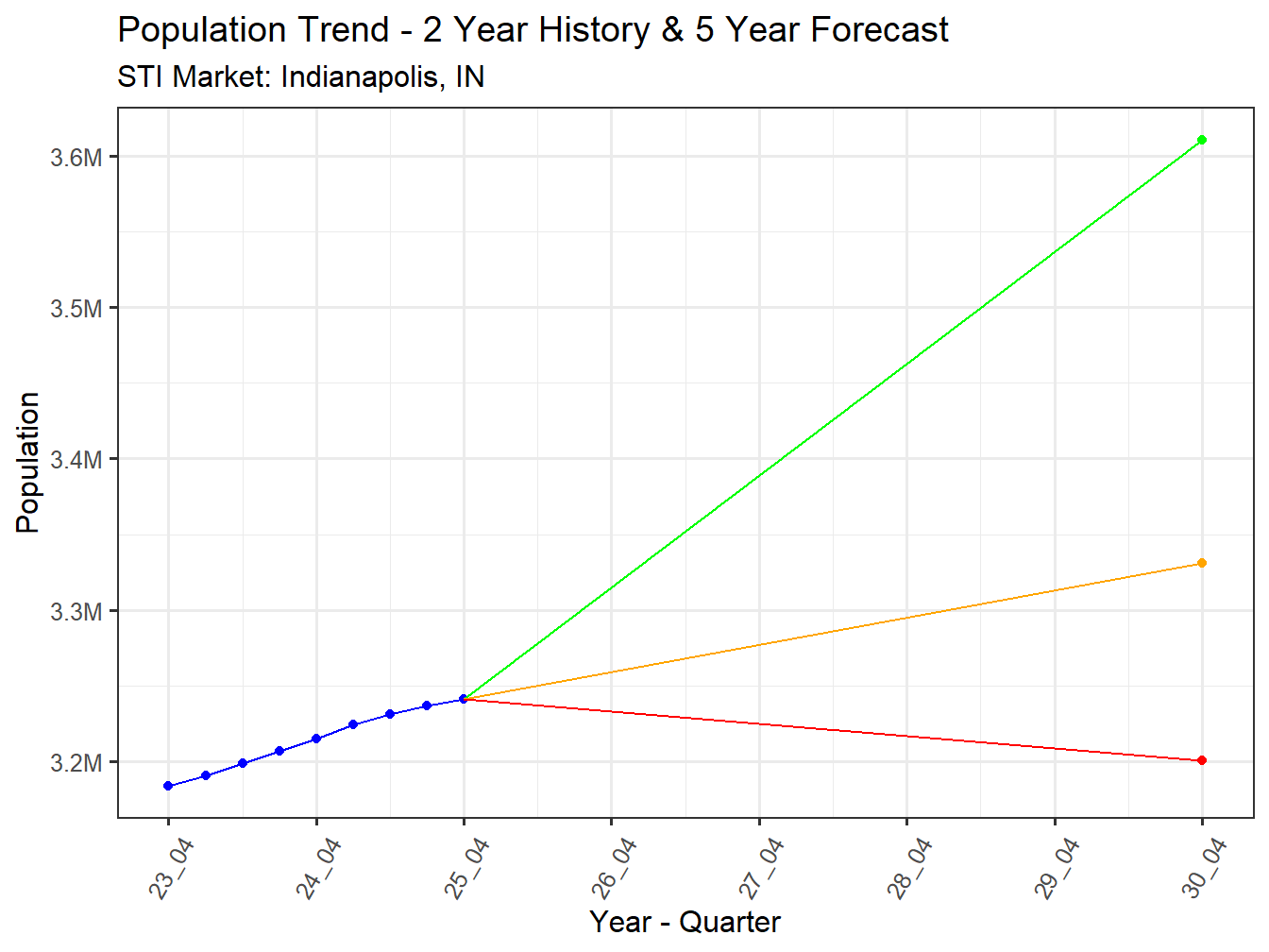 While the summation of mid range 5 year forecasts foresee a change in Population of 2.8% for Indianapolis, IN Market. The forecast high ranges of these forecasts leaves open the possibility for a Population change as high as 11.4% at 3,611,046. Similarly a population change as low as -1.3% at 3,200,217 is not without possibility.