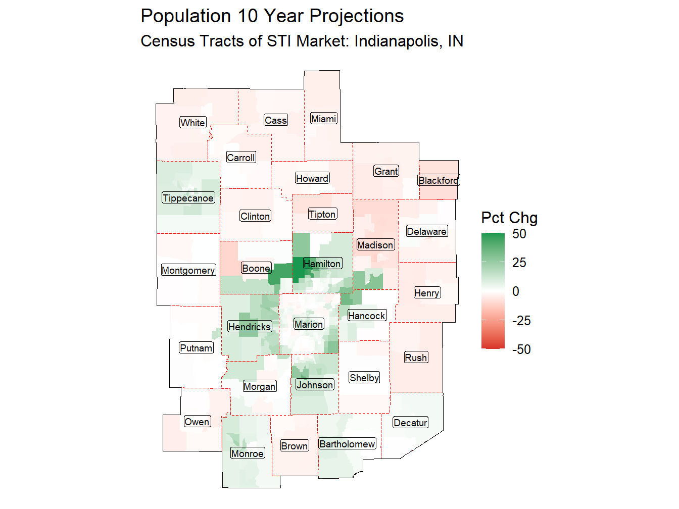 By April 2035 we project the Population of the Indianapolis, IN Market to be 3,431,650 resulting in a change of 5.9% compared to the current Population. This projected percentage change in Population ranks 77th across STI Markets. The Indianapolis, IN Market currently ranks 27th in overall population, and will rank 30th by April 2035.