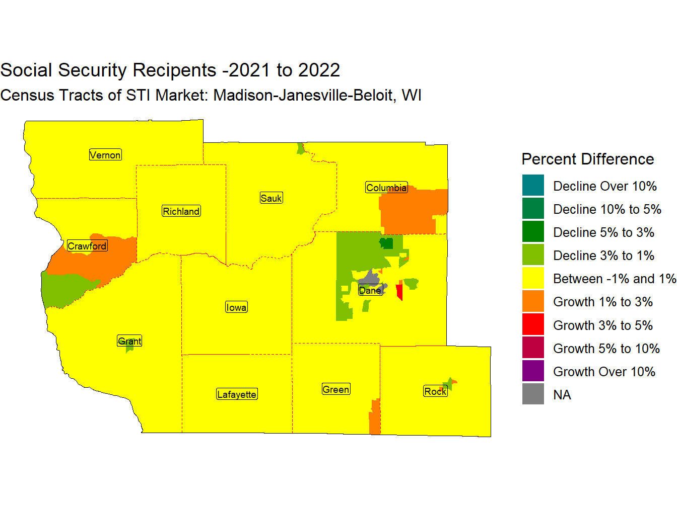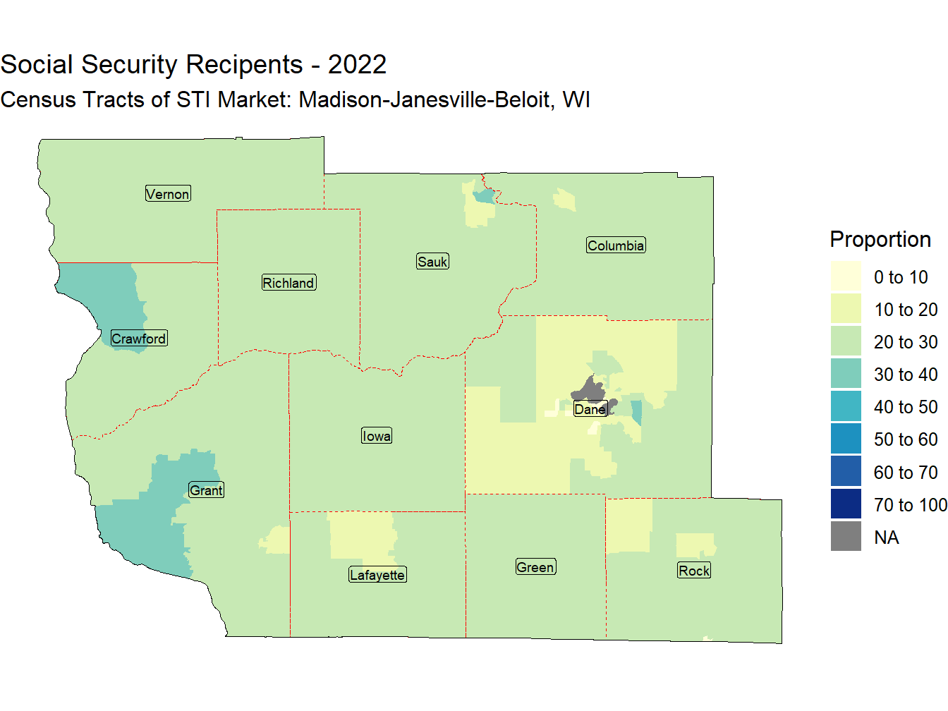 In the Madison-Janesville-Beloit, WI Market, 208,832 out of the Population of 1,085,767, 19.2%, receive some type of Social Security benefit. This is 1.03 times the National proportion of Social Security Recipients of 18.6%. The market ranks 117th across STI Markets in the proportion of Social Security recipients.