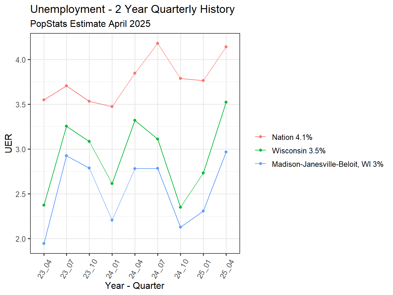 With an Unemployment Rate of 3% the Madison-Janesville-Beloit, WI currently ranks 157th in Unemployment among the 167 STI Markets.