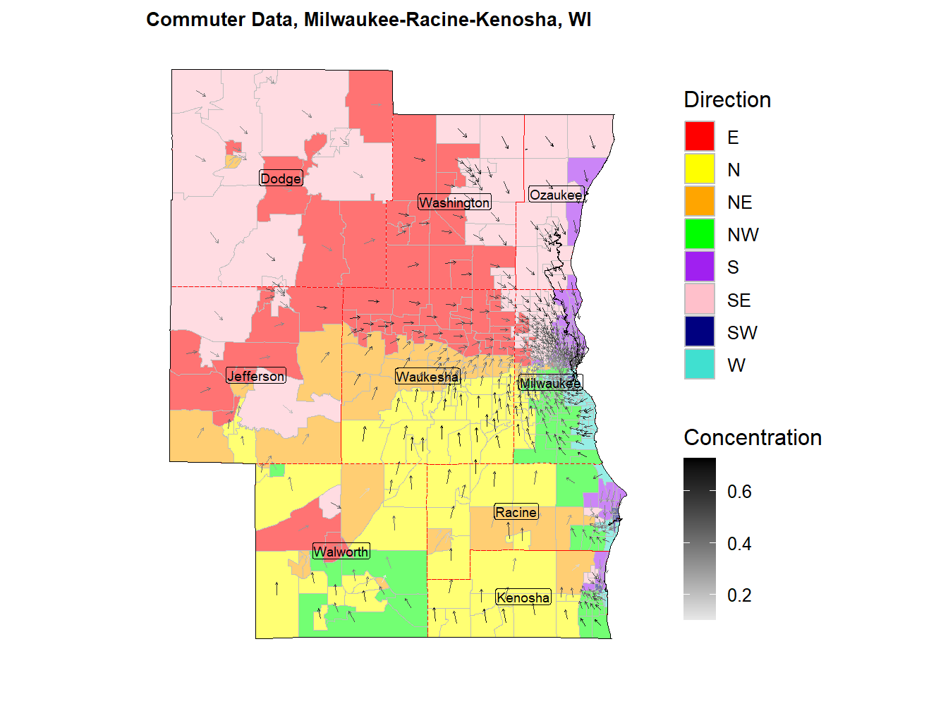 The following shows the commute to work patterns for the Milwaukee-Racine-Kenosha, WI Market. The average direction is found via a circular mean function. The concentration is the proportion of overall travel headed in that direction and those adjacent to that direction. Length of arrow is scaled by the distance traveled. Together this allows for a general view of how traffic flows around the market each morning.