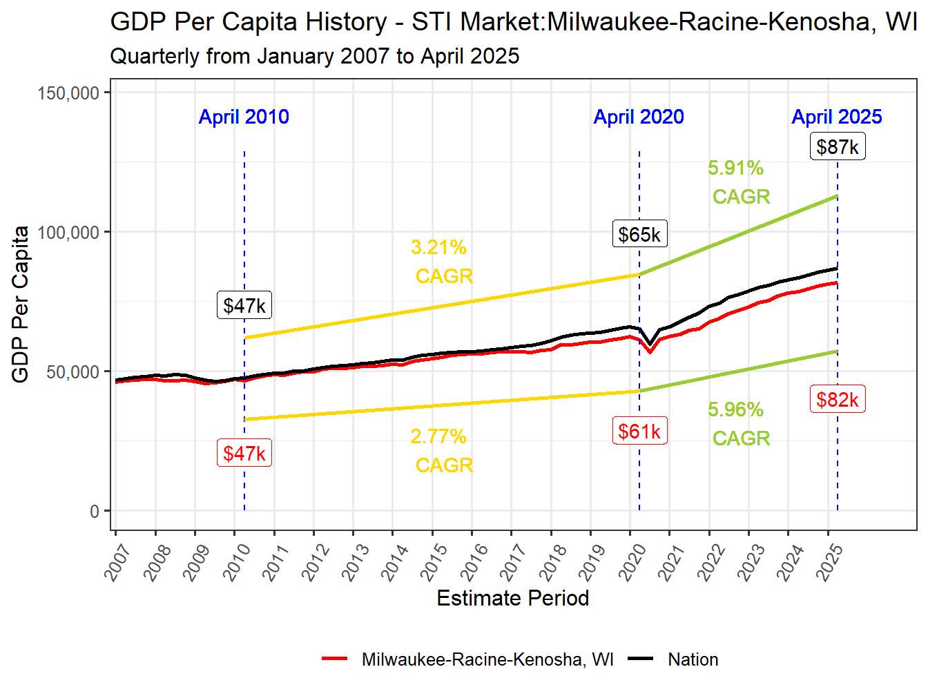 With a GDP of $182.89 billion the Milwaukee-Racine-Kenosha, WI Market represents 0.61% of the $29.8 Trillion national GDP. In terms of total GDP this market ranks 44th across STI Markets.