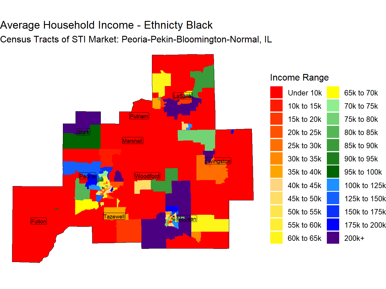 With an Average Household Income for those head of householders identifying as Non-Hispanic Black of $65,202 the Peoria-Pekin-Bloomington-Normal, IL market ranks 143rd across STI Markets.