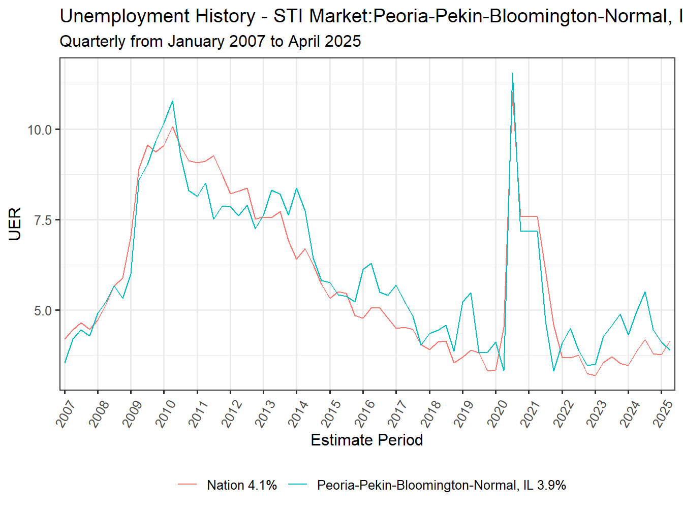 With an Unemployment Rate of 3.9% the Peoria-Pekin-Bloomington-Normal, IL currently ranks 76th in Unemployment among the 167 STI Markets.