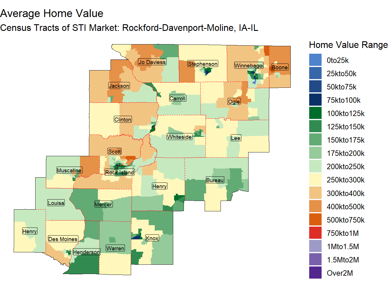 The Average Home Value for owner occupied housing units in the Rockford-Davenport-Moline, IA-IL Market is $249,255. This ranks 149th across STI Markets. Over the last 2 years there has been a change of 16.2% in this markets Average Home Value, compared to a national change of 11.8%. This 2 year change in home values ranks 21st across STI Markets.