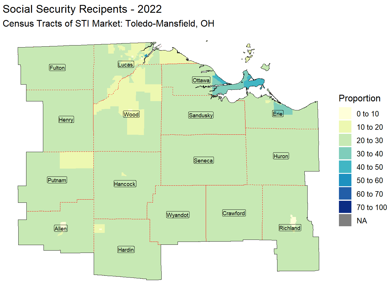 In the Toledo-Mansfield, OH Market, 299,051 out of the Population of 1,343,009, 22.3%, receive some type of Social Security benefit. This is 1.19 times the National proportion of Social Security Recipients of 18.6%. The market ranks 55th across STI Markets in the proportion of Social Security recipients.