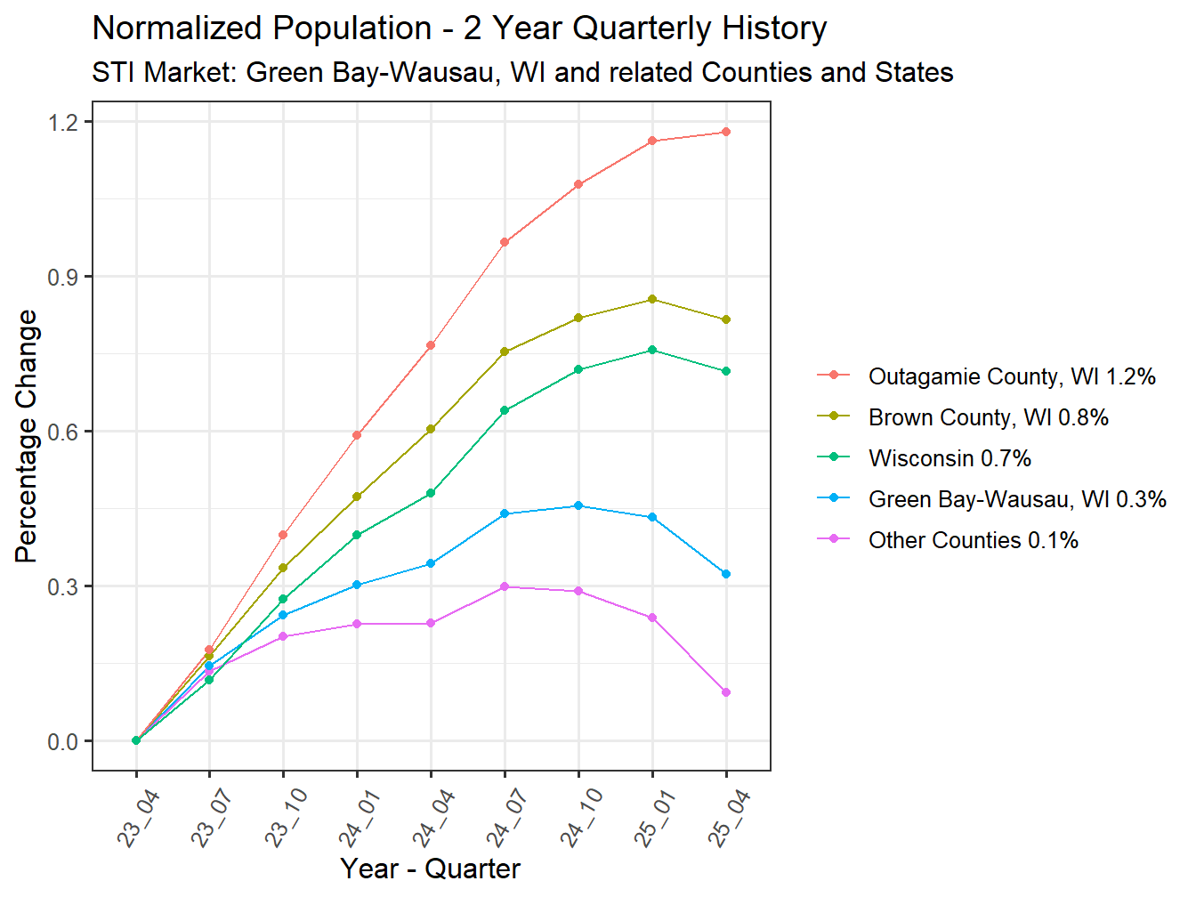 With a 2 Year Compound Annual Growth Rate (CAGR) of 0.16% the Green Bay-Wausau, WI Market is growing. It ranks 111th in 2 year population change across all STI Markets.
