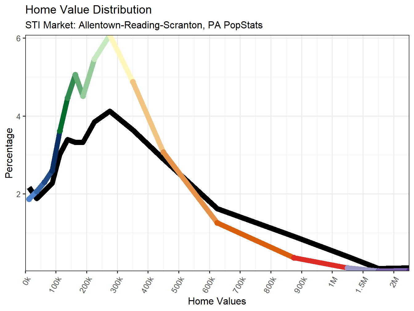 Overall Affordability can be classified in a similar fashion, comparing the Markets Average Home Value with the Average Household Income. This Affordability ratio currently sits at 3.4. The Allentown-Reading-Scranton, PA Market therefore earns the Accessible classification for housing affordability and ranks 87th across STI Markets. The following chart shows how markets compare between these two measure. Note the breaks between affordability classifications are 3, 5, and 7.