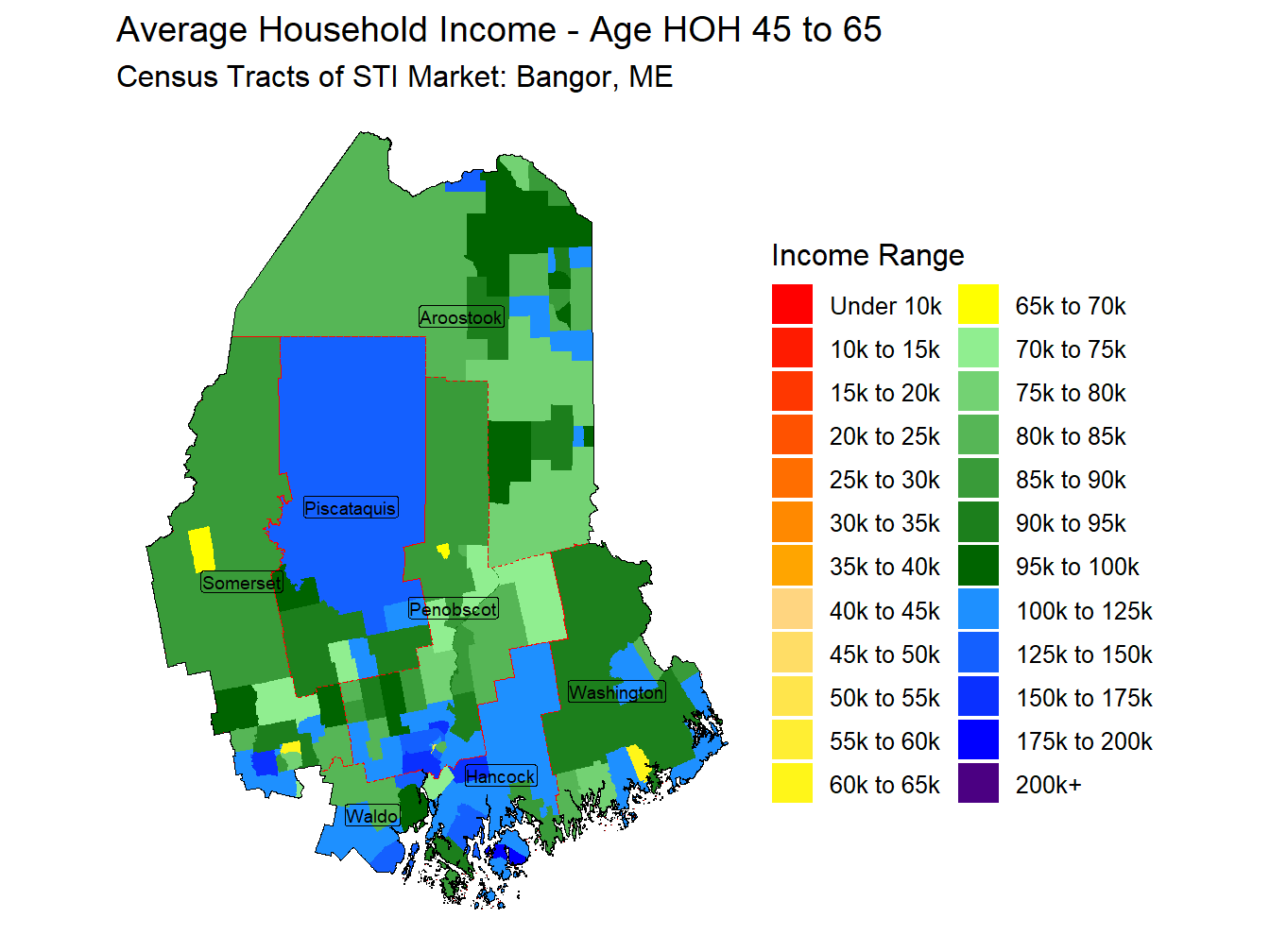 With an Average Household Income for those head of householders aged 25 to 45 of $99,968 the Bangor, ME market ranks 127th across STI Markets.