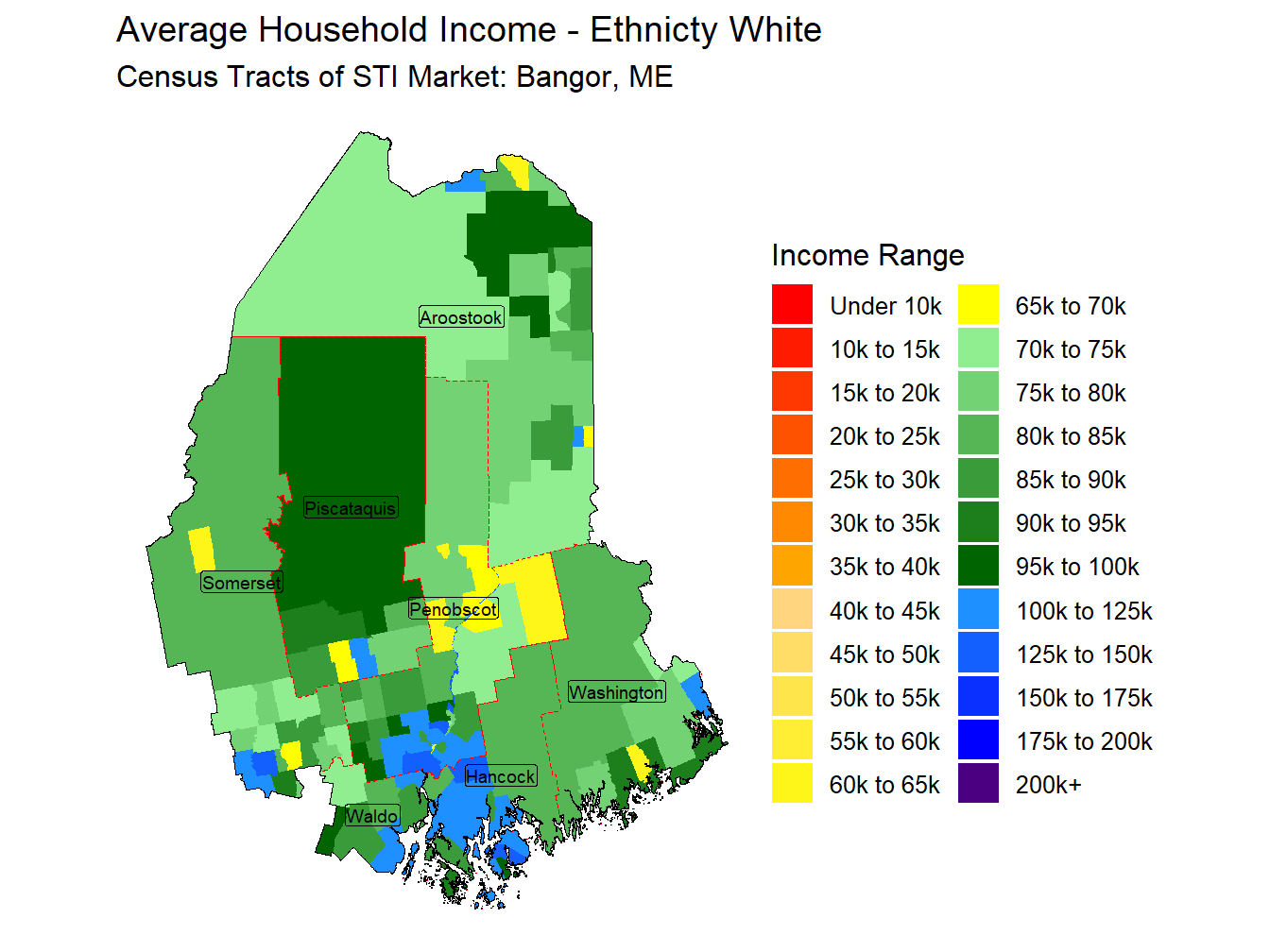 With an Average Household Income for those head of householders Non-Hispanic White of $91,100 the Bangor, ME market ranks 149th across STI Markets.
