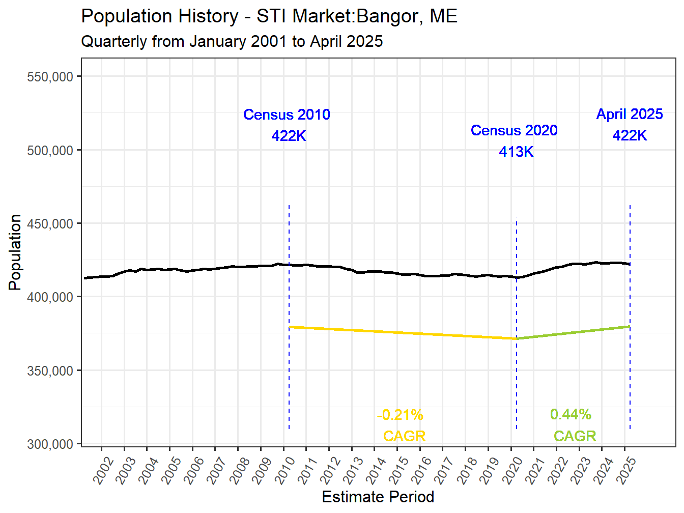 With a 2 Year Compound Annual Growth Rate (CAGR) of 0.01% the Bangor, ME Market is growing. It ranks 126th in 2 year population change across all STI Markets.