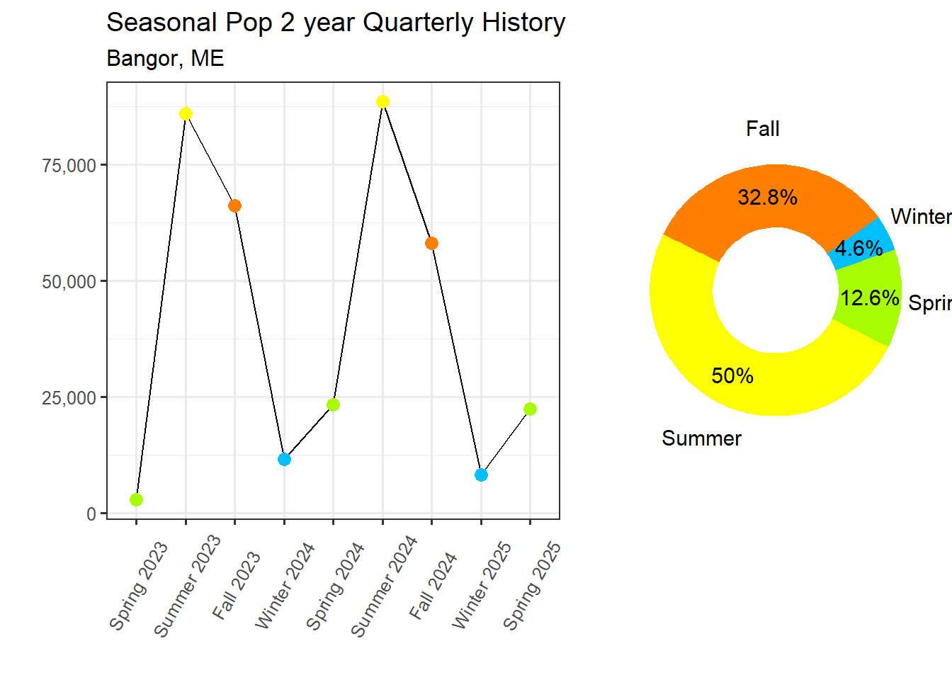 Seasonal visitation peaks in the Summer with a Seasonal Population of 88,564. The off season is the Winter with a Seasonal Population of 8,216. Given the difference between the primary and off seasons the Bangor, ME Market is classified as having a Extreme level of seasonal variation, ranking 53rd across STI Markets.
