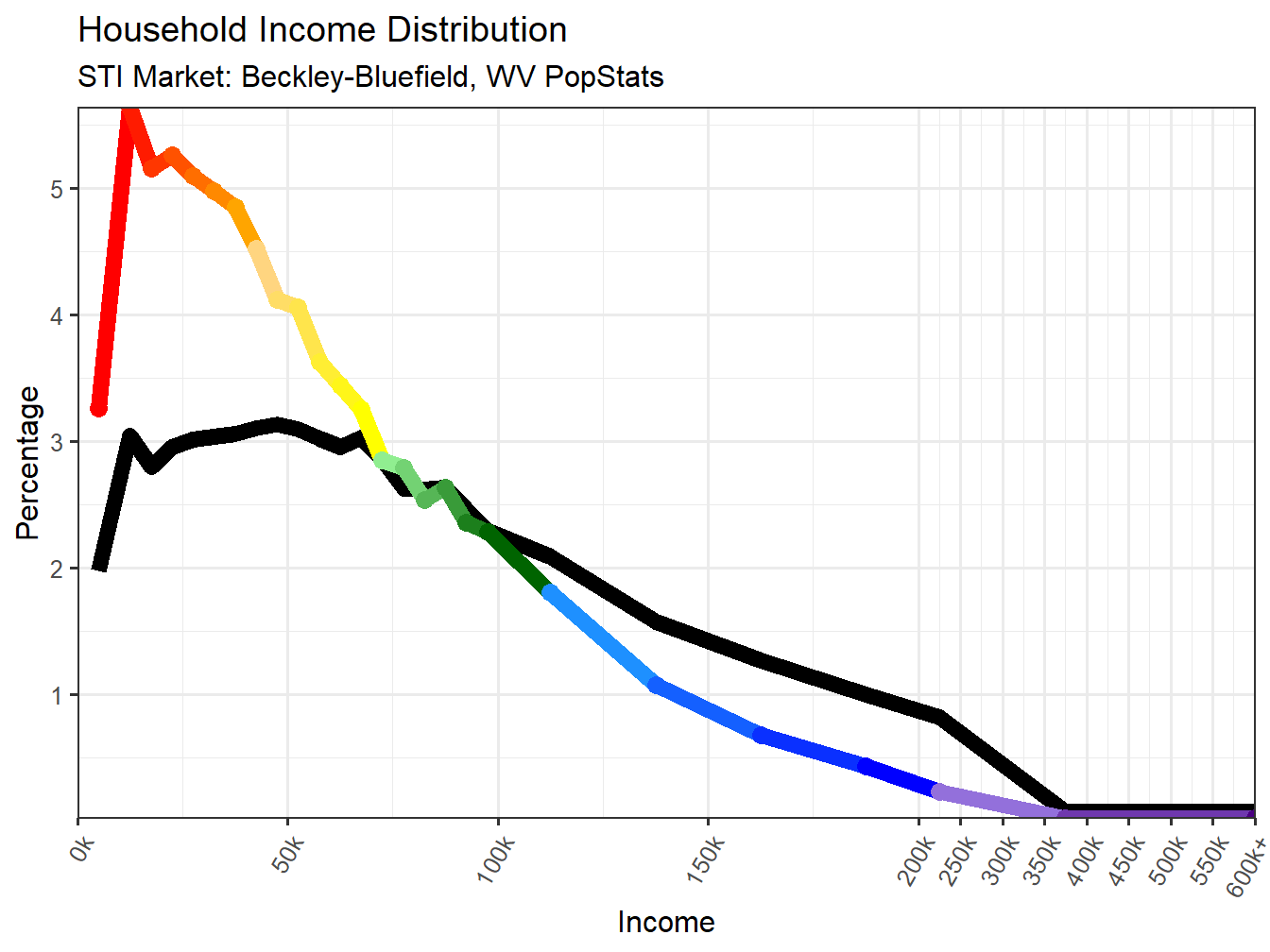 Below the multi-colored line represents the same data for household income in the Beckley-Bluefield, WV market, but more equally lays out the distribution of population versus the income level, correcting for differences in size of income ranges. You will also notice that after 200k the income ranges are scaled down so the focus is more centered on the more numerous Households making under 200k. The black line represents the National Income Distribution for comparison.