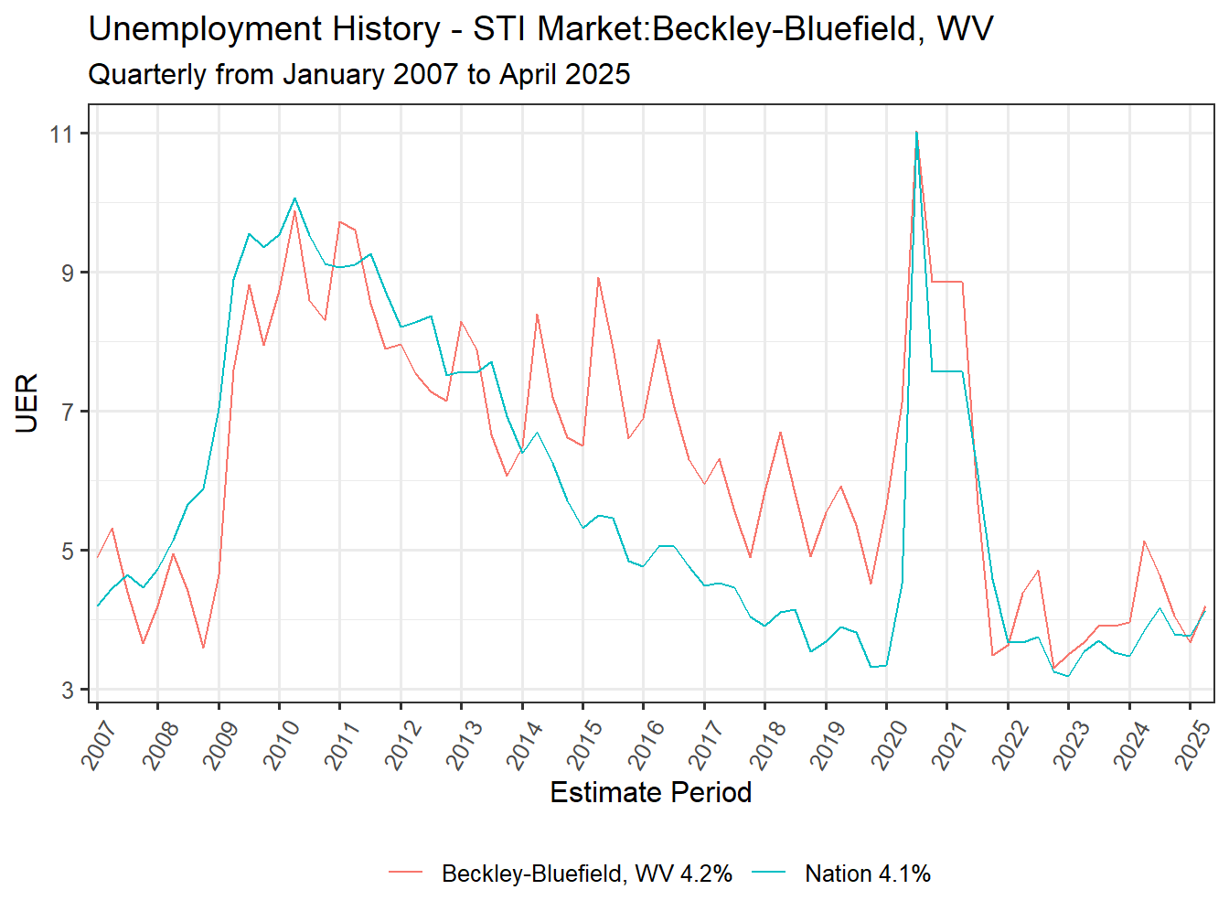 With an Unemployment Rate of 4.2% the Beckley-Bluefield, WV currently ranks 61st in Unemployment among the 167 STI Markets.