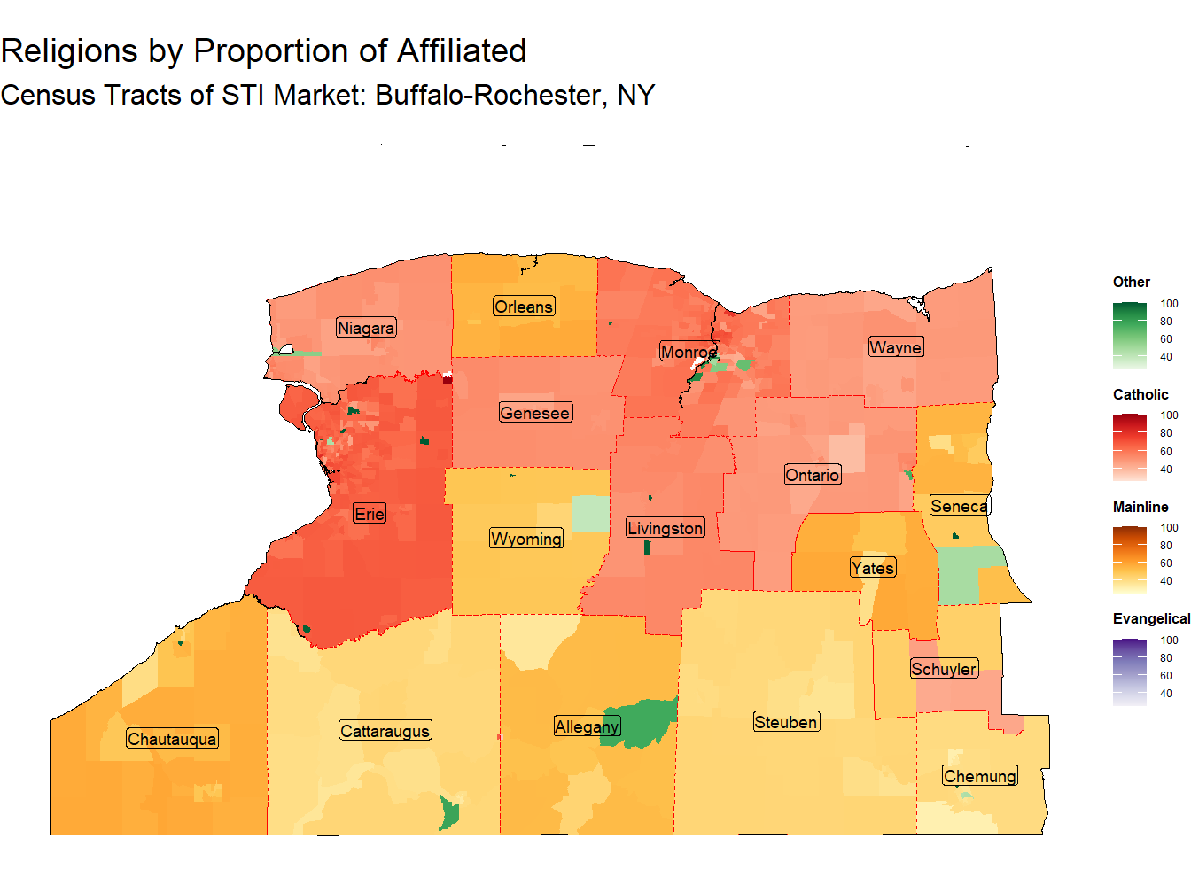 The 3 largest main religions in the Buffalo-Rochester, NY Market are Catholic, Mainline, and Evangelical . These religions make up 55.1%, 26.2%, and 9.7% of the affiliated population, respectively. When comparing to national proportions, the Catholic religion is the most notable with a location quotient of 1.42 the proportion of this religion ranks 25th across STI Markets.