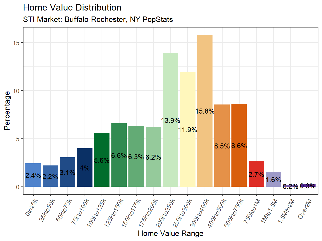 The Average Home Value for owner occupied housing units in the Buffalo-Rochester, NY Market is $308,805. This ranks 113th across STI Markets. Over the last 2 years there has been a change of 17.8% in this markets Average Home Value, compared to a national change of 11.8%. This 2 year change in home values ranks 13th across STI Markets.