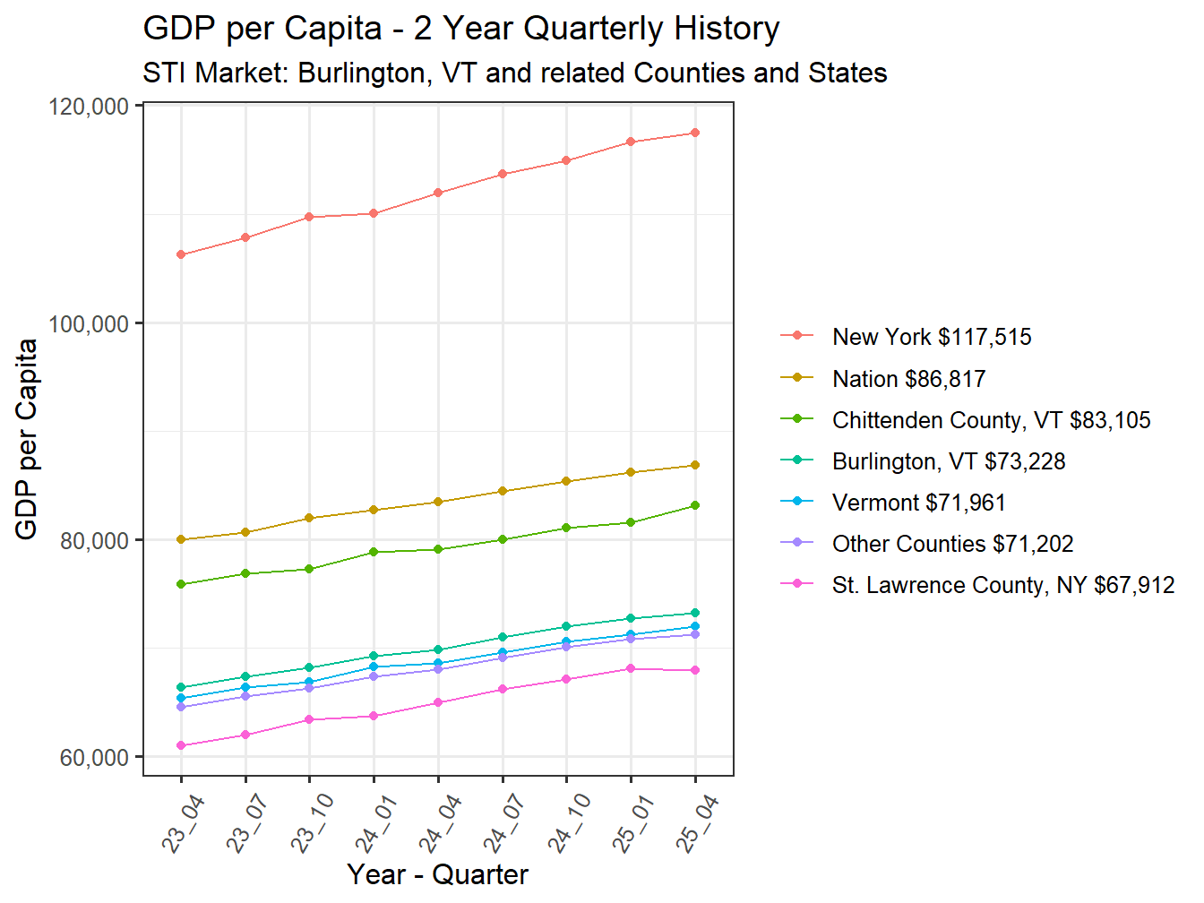 With a GDP of $61.30 billion the Burlington, VT Market represents 0.21% of the $29.8 Trillion national GDP. In terms of total GDP this market ranks 111th across STI Markets.