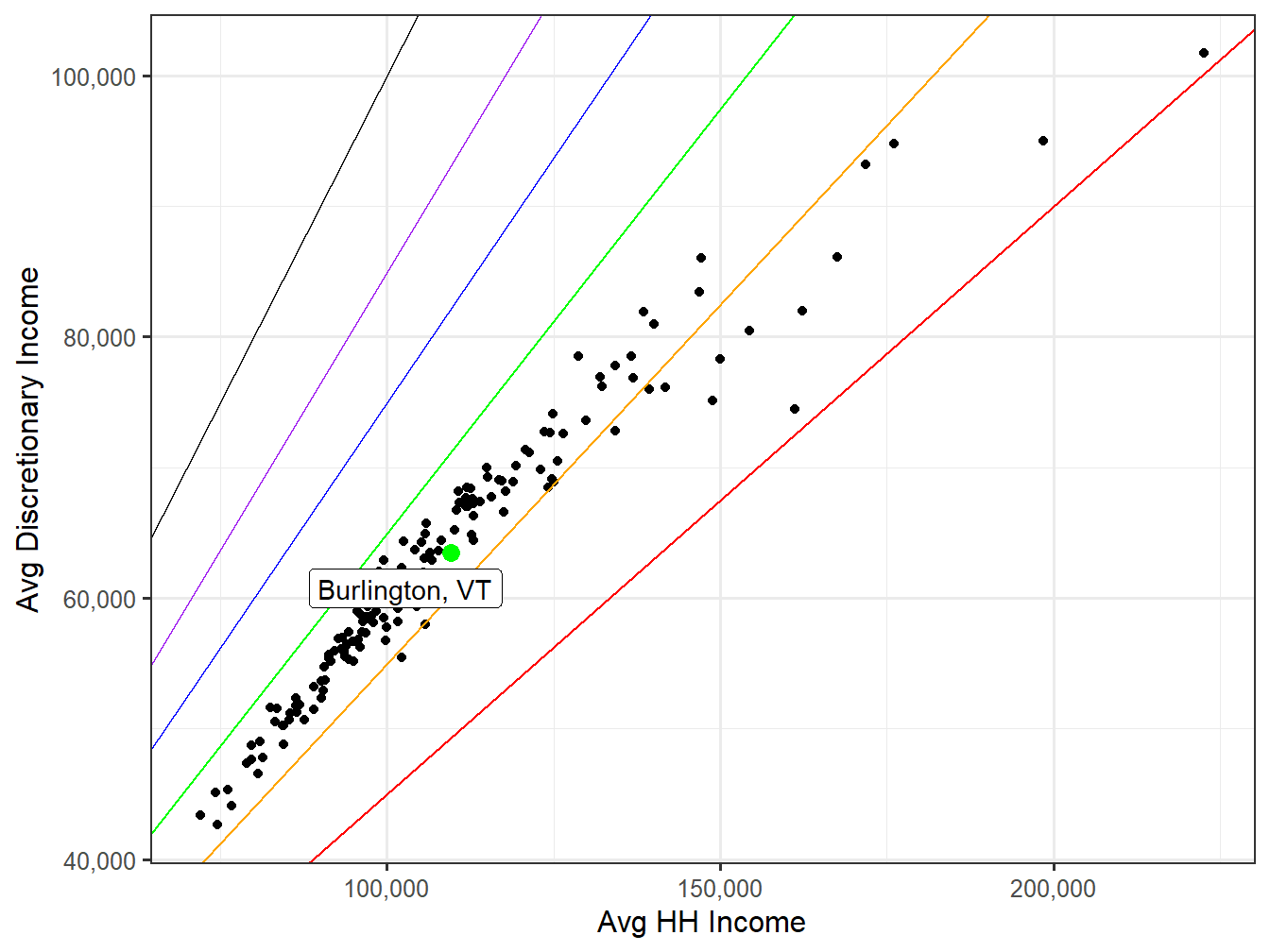 Below the multi-colored line represents the same data for household income in the Burlington, VT market, but more equally lays out the distribution of population versus the income level, correcting for differences in size of income ranges. You will also notice that after 200k the income ranges are scaled down so the focus is more centered on the more numerous Households making under 200k. The black line represents the National Income Distribution for comparison.