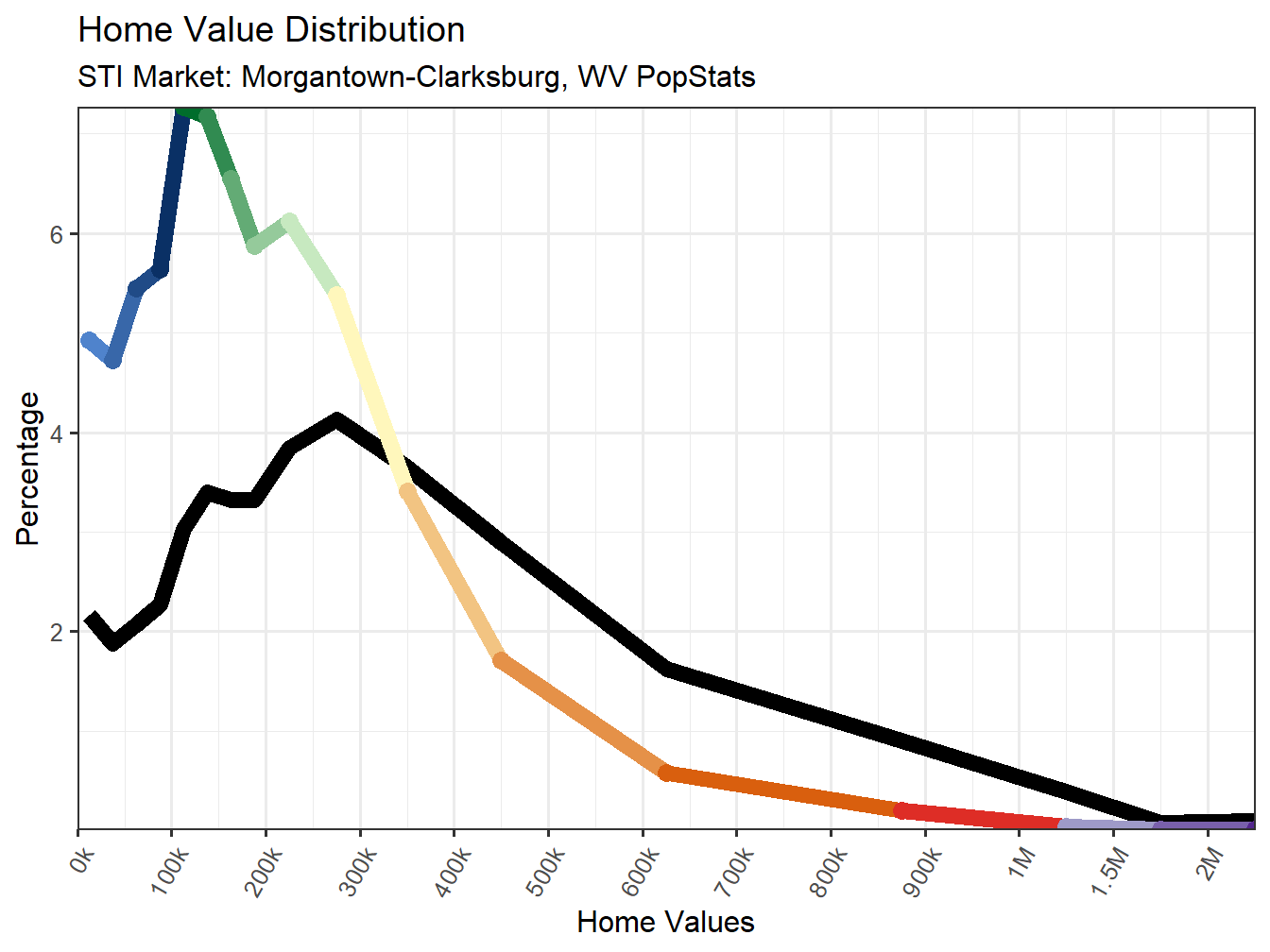 Overall Affordability can be classified in a similar fashion, comparing the Markets Average Home Value with the Average Household Income. This Affordability ratio currently sits at 3. The Morgantown-Clarksburg, WV Market therefore earns the Affordable classification for housing affordability and ranks 131st across STI Markets. The following chart shows how markets compare between these two measure. Note the breaks between affordability classifications are 3, 5, and 7.