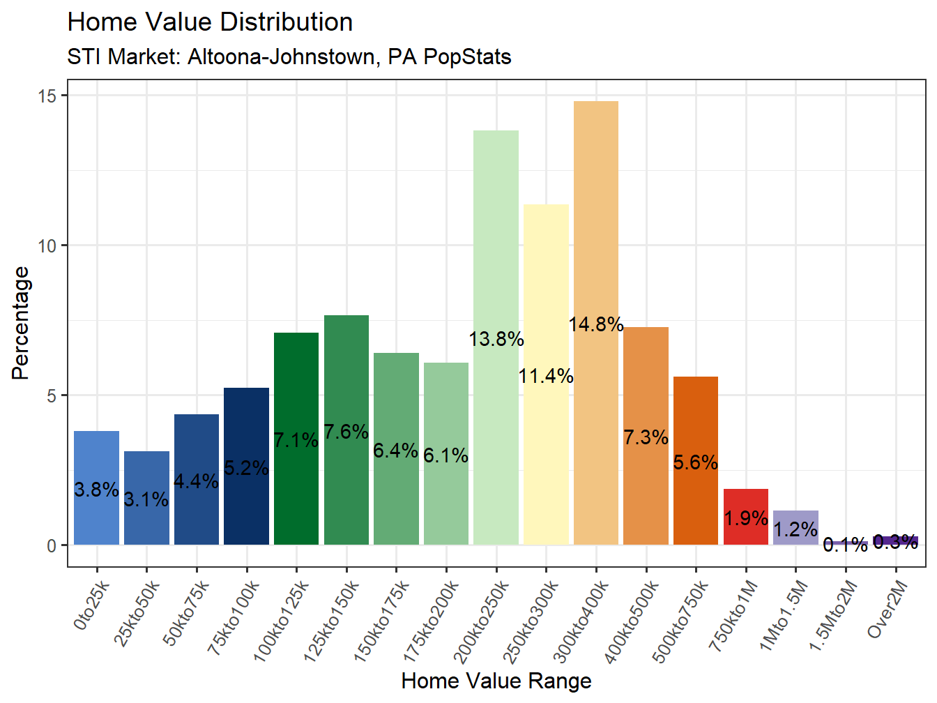 The Average Home Value for owner occupied housing units in the Altoona-Johnstown, PA Market is $273,102. This ranks 130th across STI Markets. Over the last 2 years there has been a change of 13.9% in this markets Average Home Value, compared to a national change of 11.8%. This 2 year change in home values ranks 60th across STI Markets.