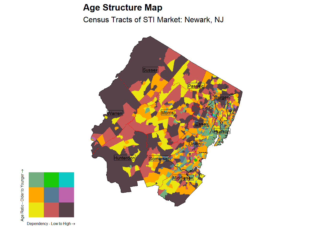 This report looks at the Age distribution of the Newark, NJ and quantifies the structure in to 9 possible categories. These are based on 2 scales, Dependency and Age Proportion Ratio of the Dependency. Dependency here is the ratio of dependent population, include older dependents over 65 and younger dependents under 15 compared to the 15 to 65 working age population. This measure is often used a way of quantify the amount of strain that the working age population might have in supporting those not working and is sometimes further refined to focus on only those currently working. In this case however we focus only on the age structure. The percentage that the young make up of the dependent population yields the Dependent Age Proportion, with a higher value indicating a younger population.