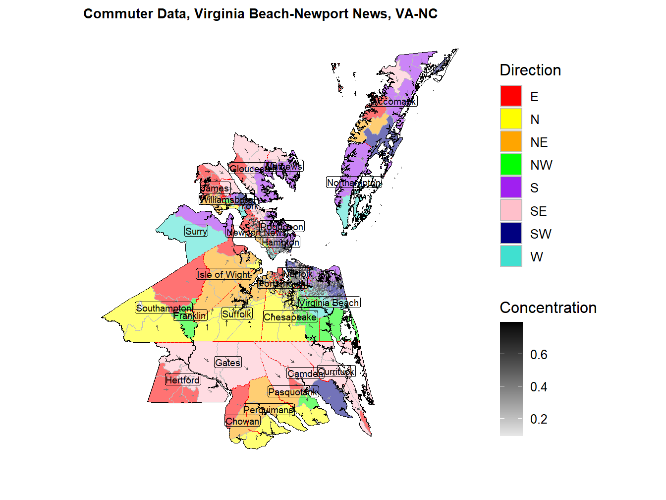 The following shows the commute to work patterns for the Virginia Beach-Newport News, VA-NC Market. The average direction is found via a circular mean function. The concentration is the proportion of overall travel headed in that direction and those adjacent to that direction. Length of arrow is scaled by the distance traveled. Together this allows for a general view of how traffic flows around the market each morning.