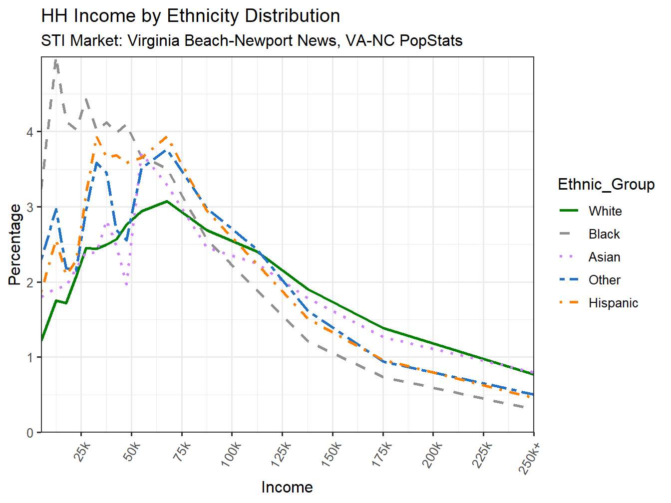 Below the multi-colored line represents the same data for household income in the Virginia Beach-Newport News, VA-NC market, but more equally lays out the distribution of population versus the income level, correcting for differences in size of income ranges. You will also notice that after 200k the income ranges are scaled down so the focus is more centered on the more numerous Households making under 200k. The black line represents the National Income Distribution for comparison.