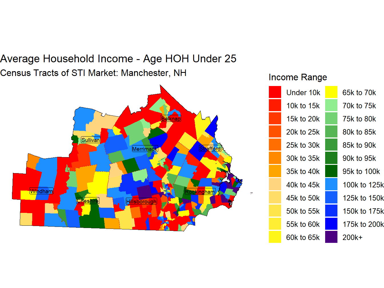 With an Average Household Income for those head of householders aged under 25 of $95,491 the Manchester, NH market ranks 8th across STI Markets.