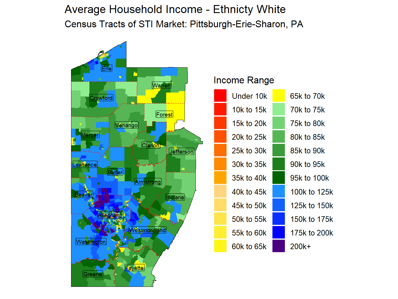 With an Average Household Income for those head of householders Non-Hispanic White of $109,099 the Pittsburgh-Erie-Sharon, PA market ranks 77th across STI Markets.