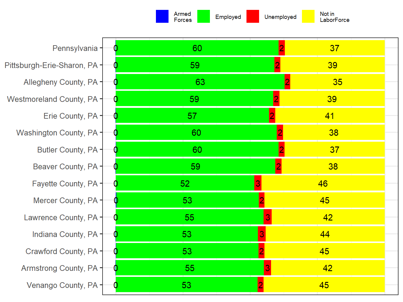 The Pittsburgh-Erie-Sharon, PA ranks 92nd in labor force participation among the 167 STI Markets with 61.2% of those 16 plus in the labor force. Of those in the Labor force 0.14% are in the Armed Forces a value 0.17 times the national average resulting in an Armed Forces employment ranking of 136th across STI Markets.
