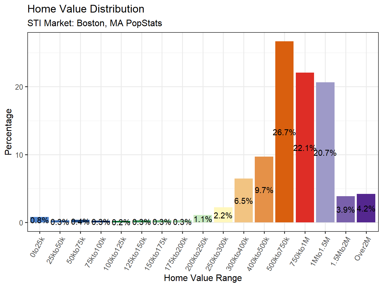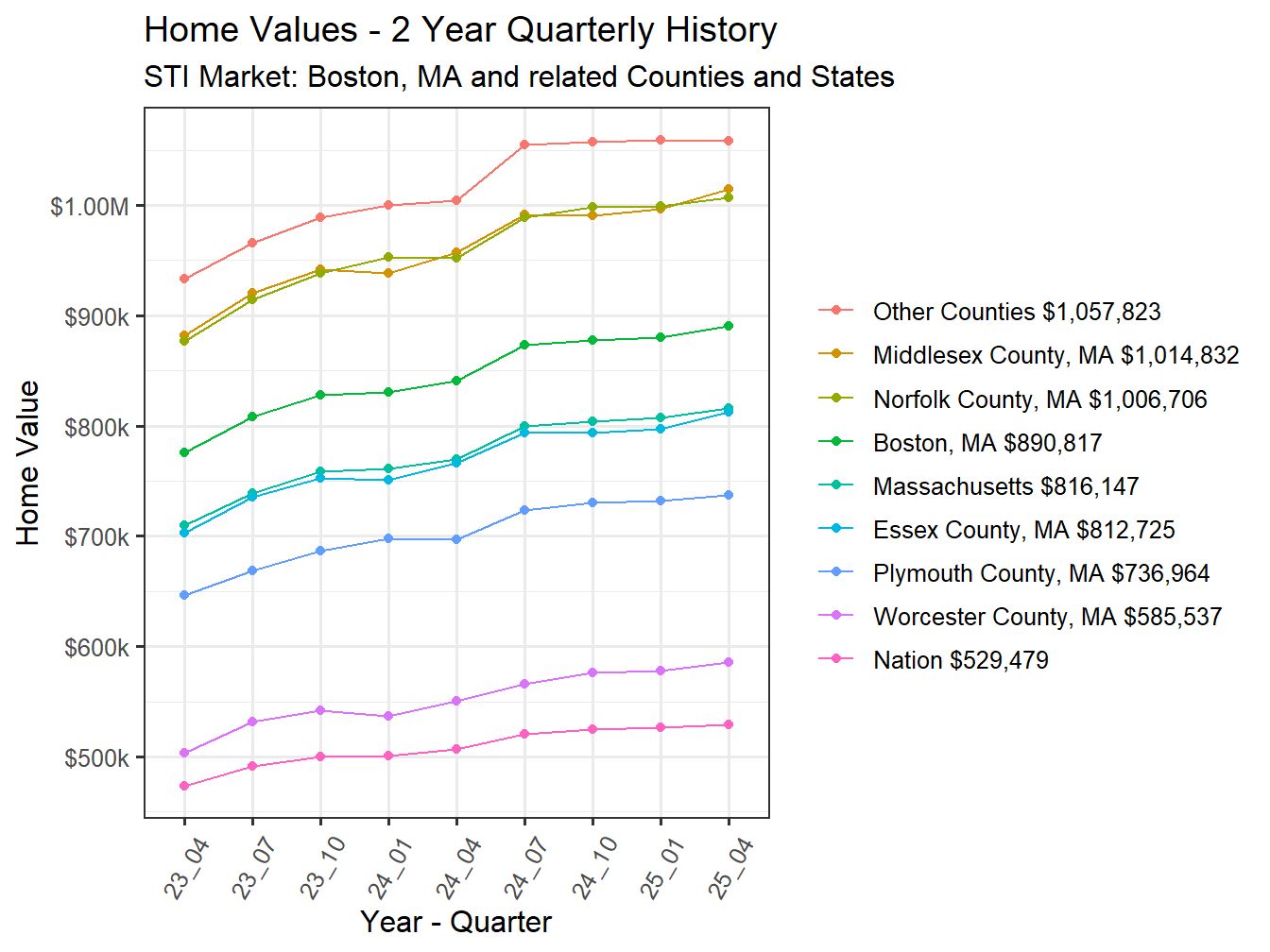 The Average Home Value for owner occupied housing units in the Boston, MA Market is $890,817. This ranks 9th across STI Markets. Over the last 2 years there has been a change of 14.9% in this markets Average Home Value, compared to a national change of 11.8%. This 2 year change in home values ranks 45th across STI Markets.